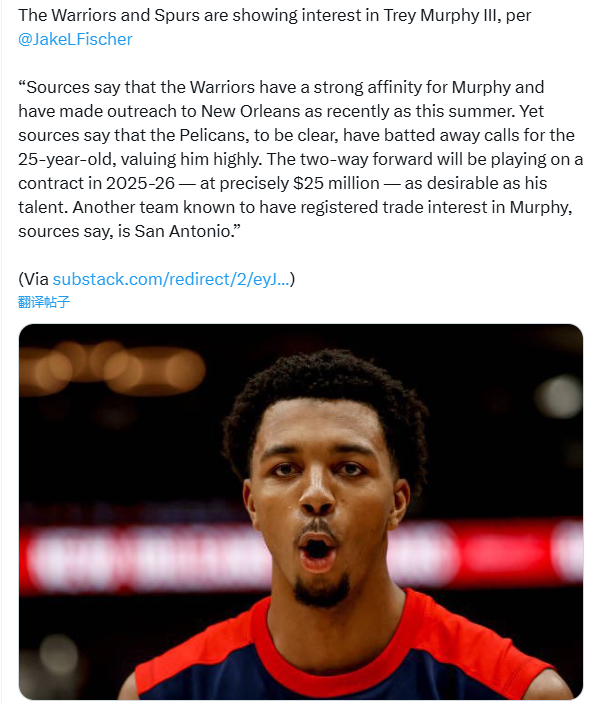 Jake Fischer还报道,多位消息人士表示,勇士对墨菲有强烈的兴趣,并且今夏曾联系过鹈鹕,但鹈鹕拒绝任何关于墨菲的交易询问;另外一支已知对墨菲表达交易兴趣的球队是马刺。
