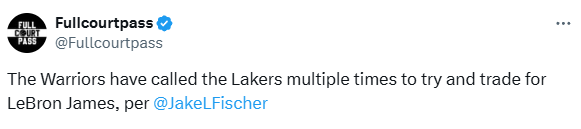 Jake Fischer报道,只要詹姆斯在湖人的未来仍旧不确定,勇士就会被视为是詹姆斯的潜在追求者;我被告知,勇士在过去18个月里在多个场合致电联系湖人,看看能否有办法通过交易得到詹姆斯,来和库里搭档;勇士热衷于追求大牌球星,他们曾成功引援杜兰特,今年2月份则是引援巴特勒。